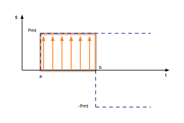 Conforme a figura abaixo, o fluxo de caixa discreto pode ser representado pela diferença de dois fluxos de pagamentos perpétuos defasados no tempo.