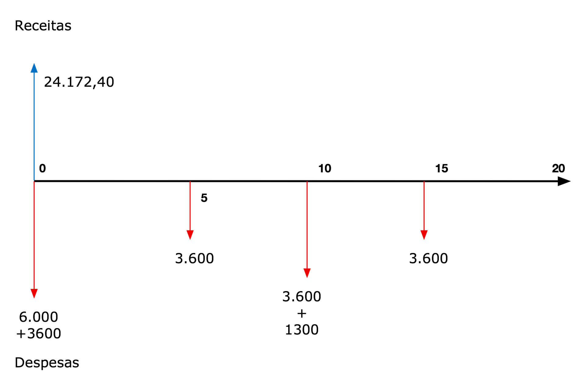 A Figura 5 apresenta o fluxo de caixa de um projeto fictício. Por convenção, despesas aparecem como vetores negativos e receitas como vetores positivos. Quando as receitas ou despesas são iguais, os vetores aparecem como linhas pontilhadas.